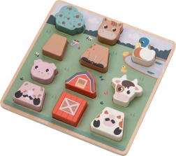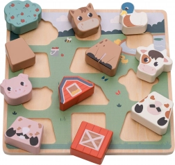 Roztomilá drevená vkladačka s 11 dielikmi s motívom zvieratiek na farme pre malých objaviteľov od 12 mesiacov. Podporuje jemnú motoriku, koordináciu oko–ruka a učenie hrou. Dieliky sa ľahko uchopujú a možno sa s nimi hrať aj samostatne. Vyrobené z kvalitného dreva.