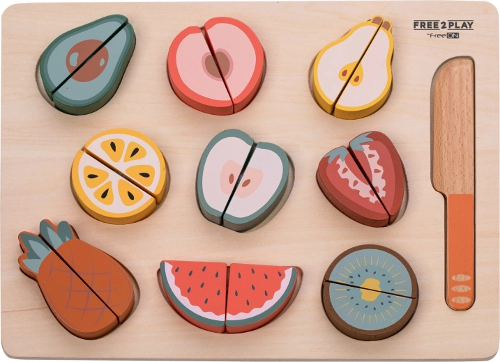 Drevená sada Krájanie ovocia na doštičke FREE2PLAY je ideálnou pomôckou pre prvé kuchynské hry. Deti sa zoznamujú s rôznymi druhmi ovocia, učia sa tvary a farby a bezpečne trénujú „krájanie“ pomocou dreveného nožíka. Jednotlivé polovice ovocia držia pokope vďaka suchému zipsu a pri rozpojení vydávajú uspokojivý zvuk, ktorý motivuje k ďalšej hre.