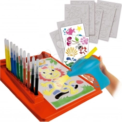 - Automatická striekacia pištoľ, 10 farebných fixiek, kresliace centrum, šablóny, návod