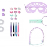 Súčasťou je aj tričko a čelenka, ktoré možno zdobiť nacvakávacími ozdobami. Kompletné balenie zahŕňa všetko, čo deti potrebujú na okamžitú hru – od hrebeňa a gumičiek po sponky a farebné fixky. Skvelý darček podporujúci kreativitu, jemnú motoriku aj fantáziu.
