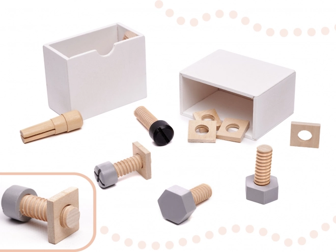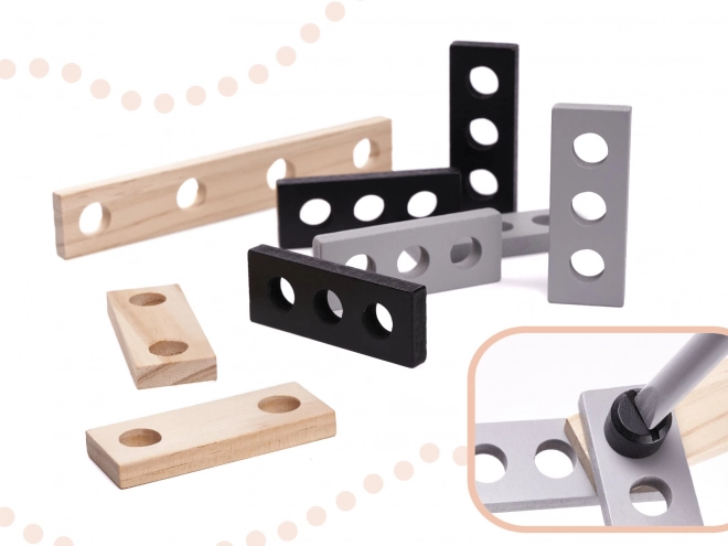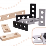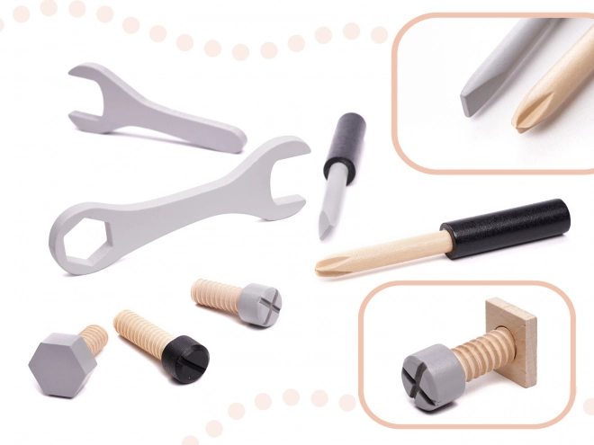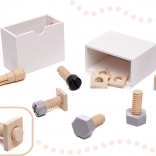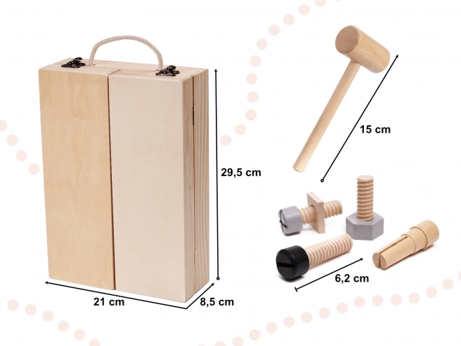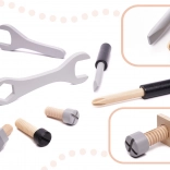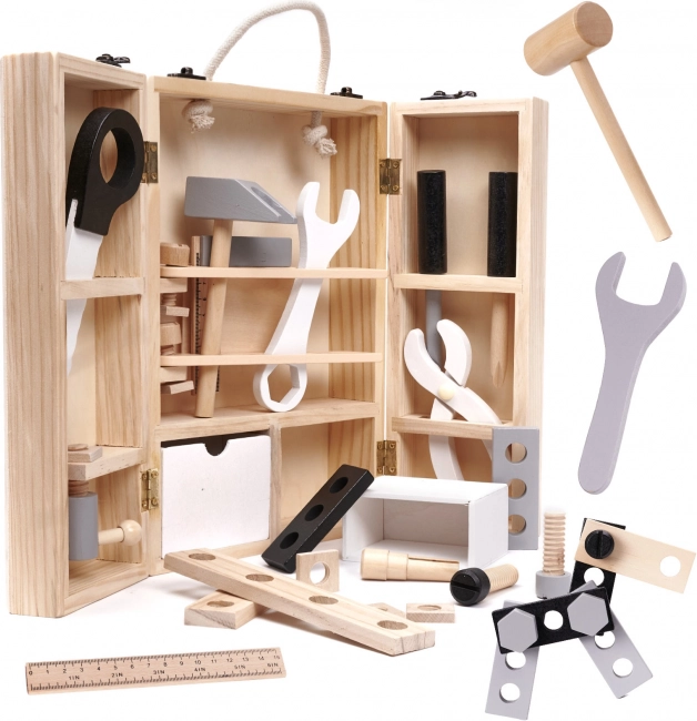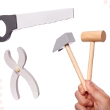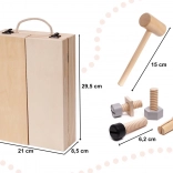 Táto veľká drevená súprava náradia splní sen každého malého kutila. Skrutkovače, kladivo, skrutky, kľúče - všetky prvky potrebné v profesionálnej dielni. Dieťa poteší možnosť neobmedzeného vŕtania, zatĺkania klincov a rezania. Vďaka drevenému boxu s rukoväťou je celá súprava mobilná, takže dieťa si bude môcť vziať náradie so sebou na akýkoľvek naliehavý problém.