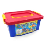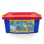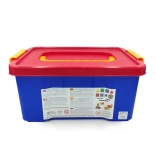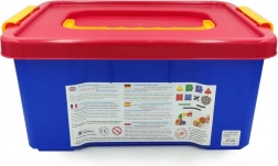Krabica s červeným vekom a modrou základňou je ideálna na uskladnenie a prenášanie kociek, čo pomáha udržiavať poriadok.
