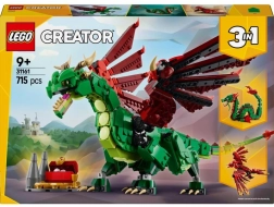 So stavebnicou LEGO Creator 3 v 1 Stredoveký drak deti ľahko vstúpia do sveta rytierov, hradov a mýtických tvorov. Hlavný model prináša detailného zeleného draka s polohovateľnými krídlami, krkom, tlamou, nohami aj chvostom, takže si ho môžu nastaviť do akčných póz. Súčasťou je tiež truhla s pokladom pre ešte bohatšie príbehy.
