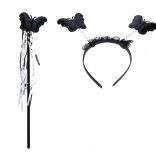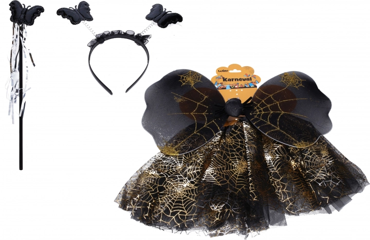 Štýlový karnevalový set pre malé víly a motýlikov v elegantnej čiernej farbe. Obsahuje všetko potrebné na rýchlu premenu: krídla, sukňu (dĺžka 29 cm), kúzelnú paličku a čelenku. Ideálny na karneval, maškarný bál aj rozprávkové kostýmy.