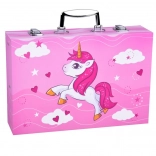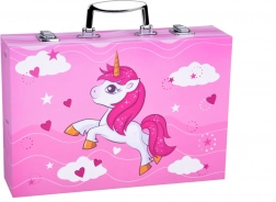 Kufrík s hravým dizajnom jednorožca, ktorý je ľahko prenosný vďaka kovovej rukoväti.