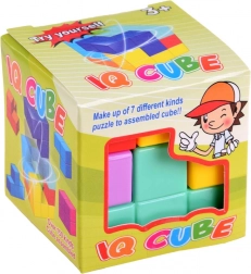 Kocka je zložená zo 7 farebných dielikov, ktoré ponúkajú nespočet možností zostavenia.