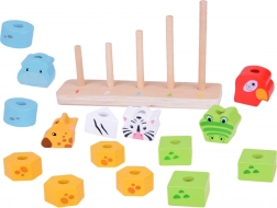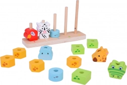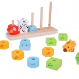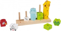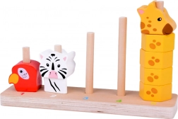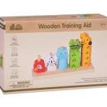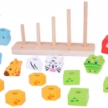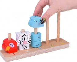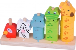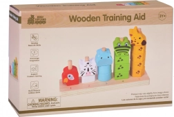Táto kvalitná drevená stohovacia hra prepája zábavu a učenie. Deti skladajú farebné dieliky a vytvárajú zvieratká v poradí od najmenšieho po najväčšie, pričom si prirodzene osvojujú počítanie 1–5, poznávanie farieb a tvarov a trénujú koordináciu oko–ruka. Pružné kolíky na základni zvyšujú bezpečnosť pri hraní.