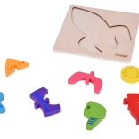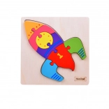 Deti si trénujú úchop, presnosť a sústredenie pri vkladaní 7 dielikov do siluety rakety na pevnej drevenej doske.