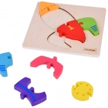 Doska aj dieliky sú z hladko opracovaného dreva, povrch je ošetrený farbami na vodnej báze a bez ostrých hrán. Vďaka kompaktným rozmerom 14,5 × 14,5 cm sa puzzle hodí domov aj na cesty a je to skvelý tip na darček.
