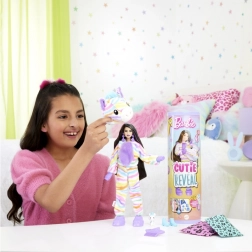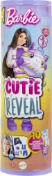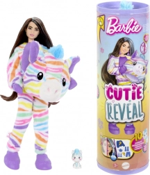 Objavujte svet prekvapení s bábikou BARBIE Cutie Reveal v kostýme dúhovej zebry. Po zložení mäkkého plyšového prevleku sa ukáže štýlová bábika so zábavnými doplnkami, dvojfarebnou módnou bundou a vzhľadom meniaci sa vodou. Súčasťou je aj roztomilé mini zvieratko a hrebeň–hubka na magické odhaľovanie farieb.