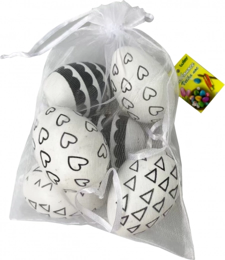 Čiernobiele dekoratívne plastové vajíčka sú perfektnou voľbou pre tých, ktorí hľadajú moderný a nápaditý doplnok do svojho domova. Vajíčka sú vyrobené z odolného plastu a dodávané v balení po 6 kusoch v elegantnom organza sáčku.