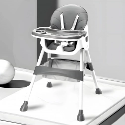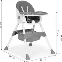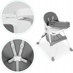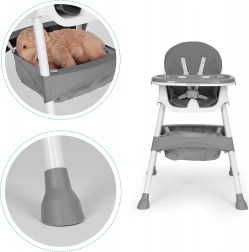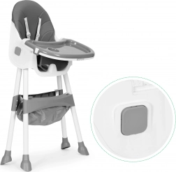 Bezpečnosť zabezpečuje 5-bodový pás a stabilné kovové nohy s protišmykovými koncovkami. Odnímateľný dvojvrstvový tácku má zvýšené okraje a držiak na pohár, hornú vrstvu možno umývať v umývačke. Skladacia konštrukcia šetrí miesto a košík pod sedadlom udrží podbradníky, obrúsky aj hračky vždy poruke.