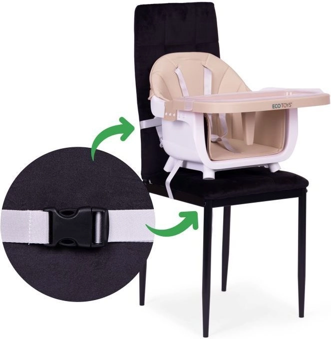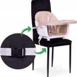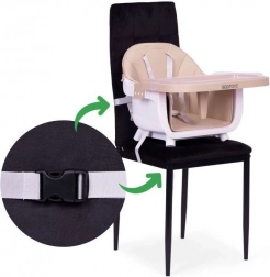 2 spôsoby použitia – doma aj na cestách: Stoličku možno používať ako klasickú vysokú stoličku alebo po odňatí nôh ako nadstavec na bežnú stoličku. Upevňovacie popruhy držia sedadlo pevne na mieste, takže si dieťa vychutná bezpečné stolovanie kdekoľvek.