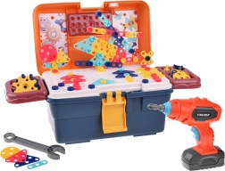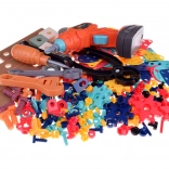 Detská batériová vŕtačka/skrutkovač, skrutkovač, kľúče a kliešte podporujú realistickú hru na remeselníka, zatiaľ čo farebné dieliky vedú deti k objavovaniu tvarov, vzorov a princípov jednoduchej mechaniky. Súčasťou je aj inšpiračná brožúrka s nápadmi na stavby.