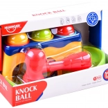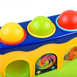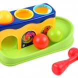 Táto interaktívna hračka prináša deťom radosť z objavovania: úlohou je pomocou červeného kladivka jemne udrieť do guľôčok v otvoroch tak, aby prepadli nadol a spustili sa po šmykľavke. Vďaka pestrým farbám a odolnému plastu, ktorý sa neodiera, si deti užijú dlhé hodiny hravého učenia.
