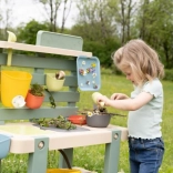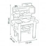 Súčasťou je 15 praktických doplnkov (sito, košík, naberačka, hrable, lopatka a i.), odkladacie plochy, háčiky a kryt zásobníka na ukrytie a uchovanie „pokladov“. Konštrukcia z kvalitného plastu s UV ochranou je stálofarebná a pripravená na vonkajšie použitie.