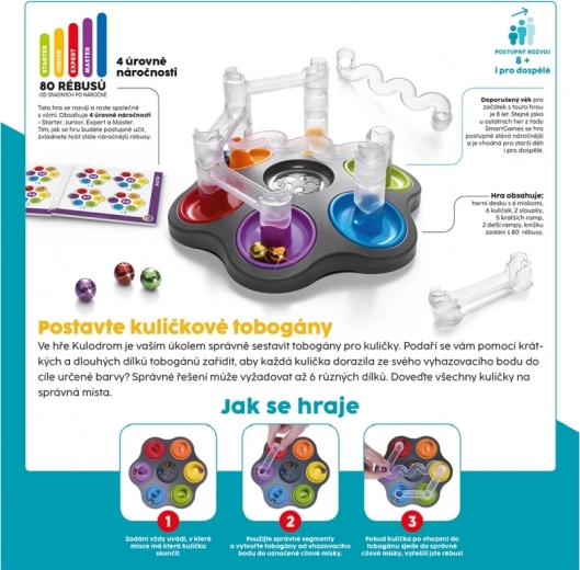 Postavte si vlastné tobogány pre guličky s hrou Smart Kulodrom! Vašou úlohou je správne zostaviť tobogány tak, aby každá gulička dorazila do cieľa. Hra zahŕňa rôzne diely tobogánu a je určená pre jedného hráča od 8 rokov.
