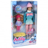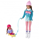 Objavte čaro zimy s mamičkou a dcérkou na sánkach. Veľká bábika má dlhé hnedé vlasy a teplú čiapku, malá bábika nosí ružovú prilbu pre bezpečnejšiu hru. Pastelové zimné oblečky s vločkami podčiarkujú atmosféru zasnežených dobrodružstiev a žlté sánky pozývajú na nekonečnú jazdu.