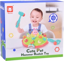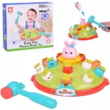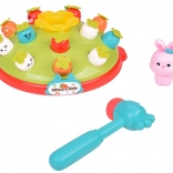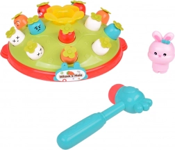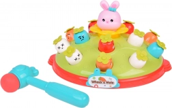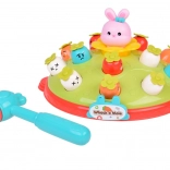 Hra Udri kladivkom ponúka deťom možnosť rozvíjať ich motorické zručnosti v zábavnom prostredí. Na farebnej platforme pripomínajúcej lúku sú umiestnené mrkvičky rôznych farieb a výrazov spolu s ružovým zajačikom, ktorý má za úlohu vyskakovať pri zásahu kladivkom. Hra je doprevádzaná veselou melódiou, ktorá priťahuje pozornosť detí. Platforma obsahuje dve úrovne mrkvičiek a dôvtipný mechanizmus, ktorý po otočení zajačika spôsobí, že vyskočí iná mrkvička z hornej úrovne.