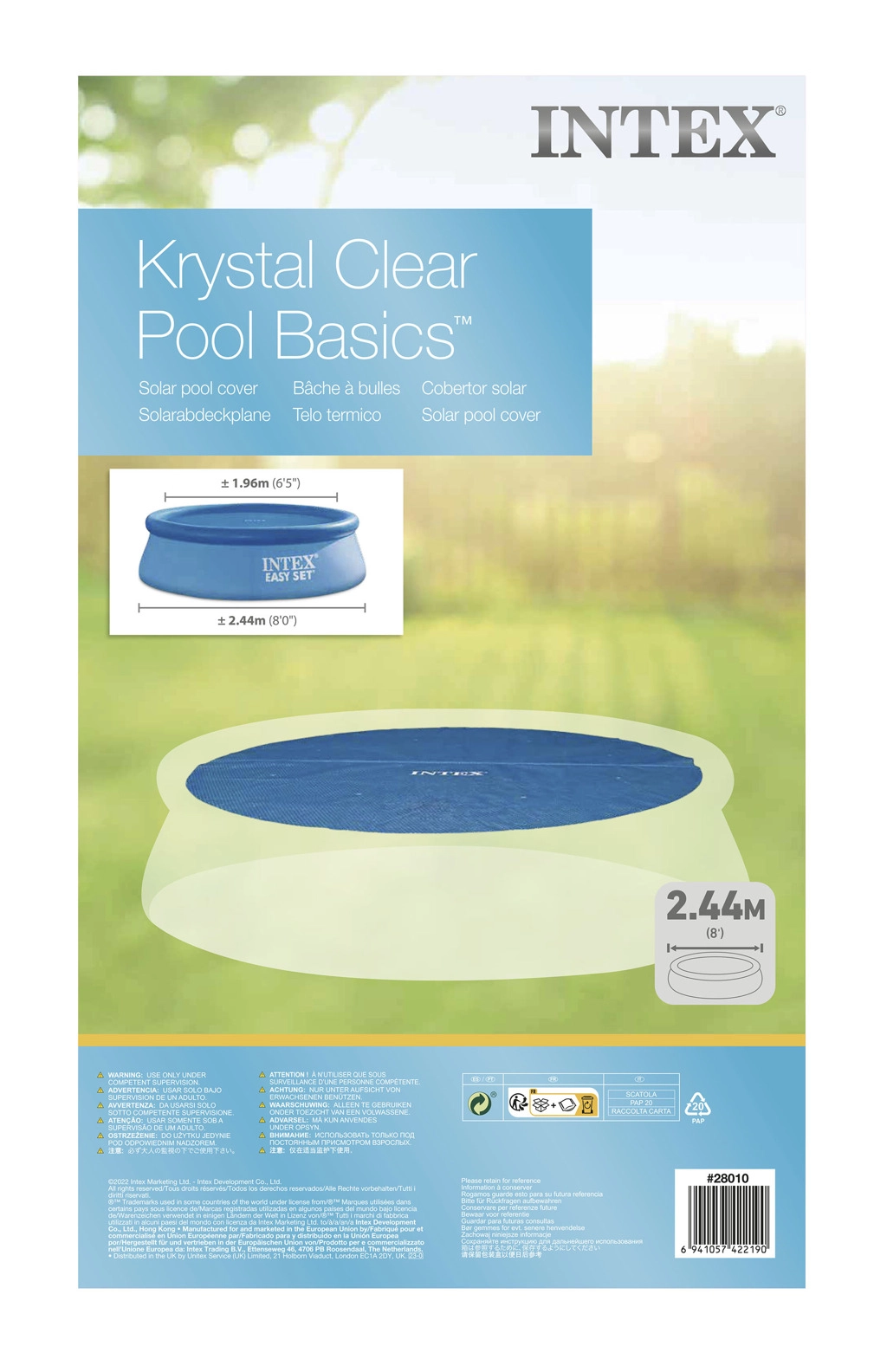 Praktická solárna krycia plachta INTEX pre kruhové bazény s priemerom 244 cm pomáha ohrievať a udržiavať teplotu vody, zmenšuje tepelné straty vďaka izolačnej vrstve a zároveň chráni hladinu pred nečistotami. Vďaka bublinkovej štruktúre efektívne využíva slnečnú energiu a je vhodná pre rámové aj stojanové bazény.