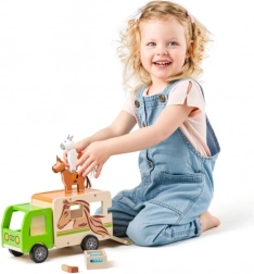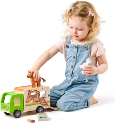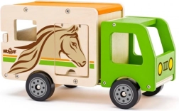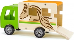 Tento precízne spracovaný drevený prepravník koní prináša deťom realistickú zábavu. Zelená kabína, prírodný vzhľad dreva a potlač s koňmi vytvárajú atraktívny dizajn, ktorý láka k príbehom z farmy aj dostihoviska. Sklopná rampa uľahčuje nakladanie koní a odolná konštrukcia zvládne každodenné hranie.
