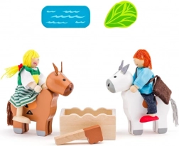 Súčasťou sady sú dve postavičky, dva kone a drevená debnička so zeleninou. Deti môžu hneď vytvárať príbehy z farmy, dostihoviska či prepravy zvierat.