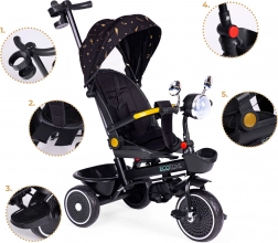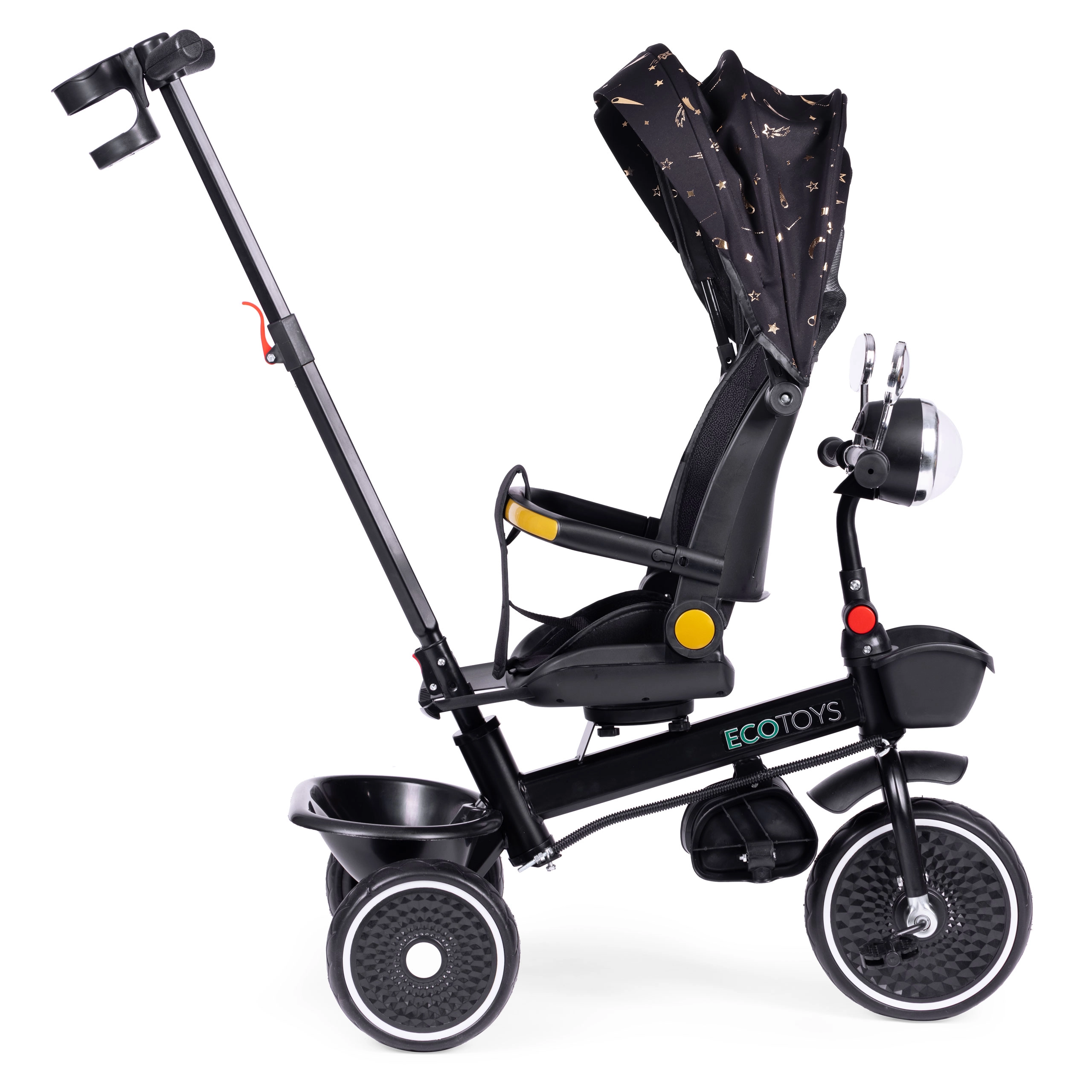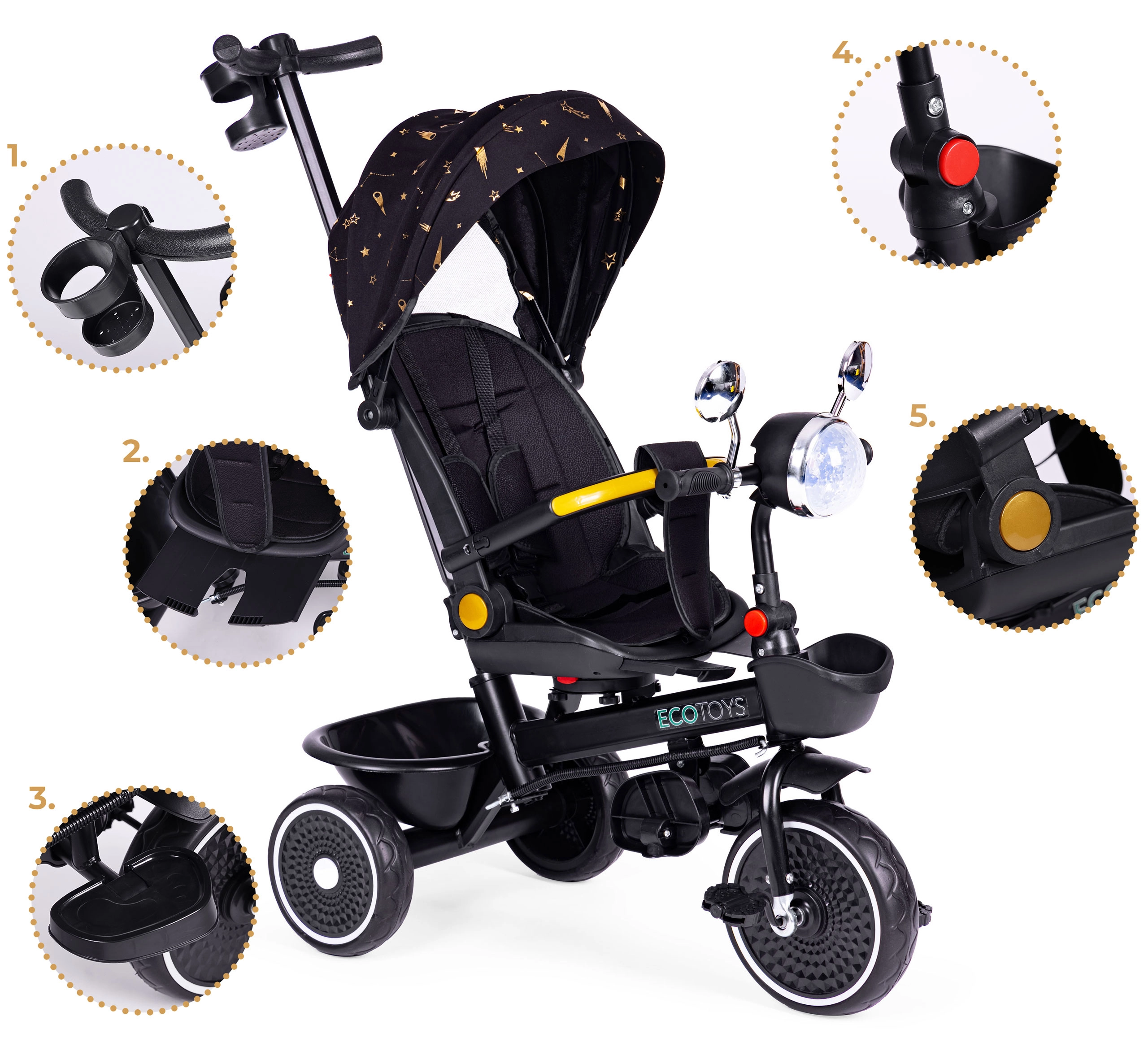 Multifunkčná detská trojkolka ECOTOYS rastie s vaším dieťaťom od 6 mesiacov do 6 rokov. Ponúka otočné sedadlo o 360°, vodiacu tyč pre rodiča, skladaciu striešku a bezpečnostné pásy aj madlá. Vďaka odolnej oceľovej konštrukcii, EVA kolesám a praktickým doplnkom (svetlo s melódiami, držiak na nápoj, úložné košíky) zaistí pohodlie, bezpečie a zábavu pri každej prechádzke.