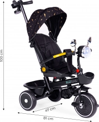 Táto šikovná trojkolka kombinuje kočík a odrážadlo v jednom. Otočné sedadlo umožní jazdu čelom k rodičovi aj v smere jazdy, nastaviteľná opierka chrbta a skladacia strieška s vetracou sieťkou chránia a zvyšujú komfort. Rodičovské riadenie priamo otáča riadidlami, takže máte smer aj tempo pod kontrolou.