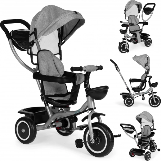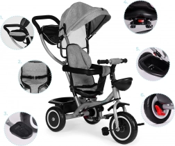 Trojkolka ECOTOYS rastie s vaším dieťaťom – od prvých jázd s rodičovským vedením až po samostatné šliapanie. Otočné sedadlo umožní jazdu čelom k rodičovi aj v smere jazdy, skladacia strieška chráni pred slnkom a vetrom a päťbodové pásy so zábranou zaistia istotu na každom povrchu.