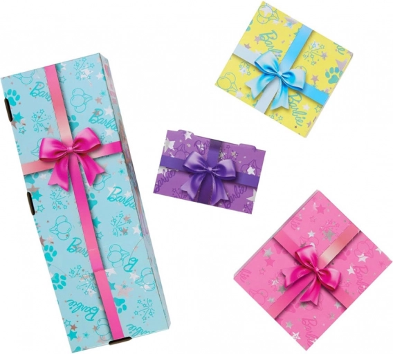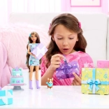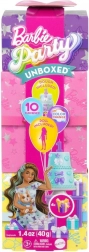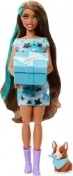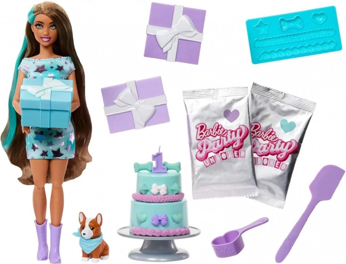 Objavte, kto sa skrýva vo vnútri! Táto varianta obsahuje brunetku BARBIE s tyrkysovými prúžkami vo vlasoch, trblietavé šaty s fialovými hviezdami a zladené fialové topánky. K setu patrí tiež roztomilý corgi so šatkou – čestný hosť každej narodeninovej párty.