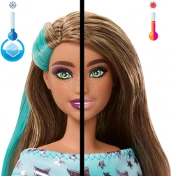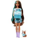 BARBIE s dlhými vlasmi a tyrkysovými prúžkami, trblietavé šaty s fialovými hviezdami a štýlové topánky. Súčasťou je aj mojkací psík so šatkou.