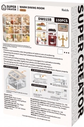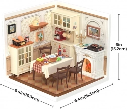 Vytvorte si vlastnú miniatúrnu jedáleň v teplých krémových tónoch s priestranným stolom, príborníkom a množstvom autentických doplnkov – od pečiva, tanierikov a hrnčekov až po kávovar, svietnik či gramofón. Realistické detaily a LED osvetlenie navodia príjemnú domácu atmosféru a dodajú modelu jedinečný šarm.