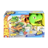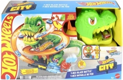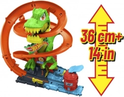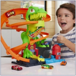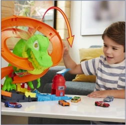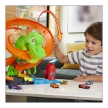 Pripravte sa na napínavú jazdu v Hot Wheels City! Spustite priložené kovové autíčko 1:64 a prežeňte sa okolo T‑rexa. Zakaždým, keď auto prejde, oči dinosaura sa otáčajú, až nakoniec padne porazený. Deti môžu skúšať rôzne scenáre – od rýchleho tankovania až po heroické víťazstvo, ktoré zachráni celé mesto.