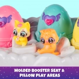 Zažite jedinečný moment liahnuťa s multi balením Hatchimals Mráčik s neónovou dúhou. Stačí vytiahnuť cumlíky z vajíčok, naplniť fľaštičku vodou a jemne ju vytlačiť do vajíčok – počas pár sekúnd sa začnú objavovať nové postavičky: Bunnypie, Puppadee a Narwing. Mimo vajíčka na vás čakajú aj Kittingale a Foxstritch. Všetko si vystavíte v jarnom košíku s vytvoreným sedadlom a vankúšikom.