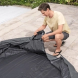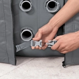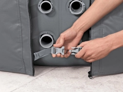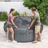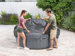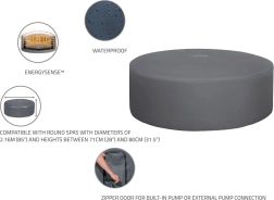 Montáž je rýchla a intuitívna. Nastaviteľný obvodový pás s bezpečnostnými klipsami zaistí pevné uchytenie, zatiaľ čo integrovaný zips umožní bezproblémové napojenie na čerpadlo bez nutnosti kryt dávať dole. Kryt je kompatibilný s modelmi Lay‑Z‑Spa St. Moritz, Monaco, Santorini HydroJet Pro a ďalšími okrúhlymi vírivkami s priemerom 216 cm.
