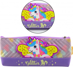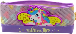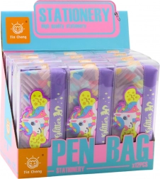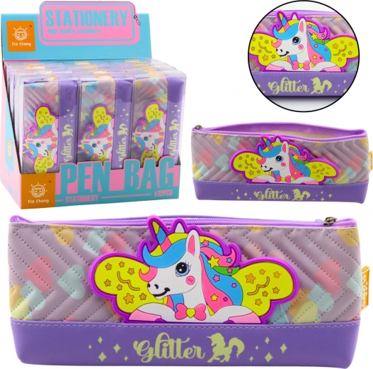 Fialový peračník s motívom jednorožca, ideálny na uchovávanie školských potrieb. Mäkký, odolný a bezpečný materiál spĺňa normy CE a EN71.