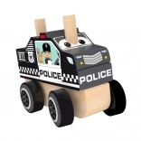 Postavte si spolu s deťmi vlastné policajné vozidlo z kvalitného prírodného dreva. Farebné kocky sa navliekajú na dve tyčinky umiestnené na základni s kolesami, takže po poskladaní môže auto hneď „vyraziť“.