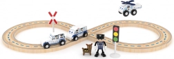 Súčasťou balenia sú koľaje a 4 policajné vozidlá, ktoré možno ľubovoľne kombinovať a zapojiť do tematických príbehov. Set je kompatibilný s bežnými drevenými vláčikodráhami, takže ho možno rozširovať o ďalšie prvky a vytvárať väčšie trate.