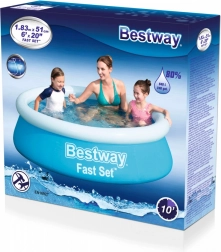 Nafukovací bazén Bestway Fast Set s priemerom 183 cm a výškou 51 cm je praktickým a ekonomickým riešením pre domáce použitie. Vyrobený je z odolného materiálu DuraPlus™, ktorý zaisťuje trvanlivosť, odolnosť voči UV žiareniu a mechanickému poškodeniu. Ľahko ho umiestnite na trávu alebo tvrdý, rovnú plochu.