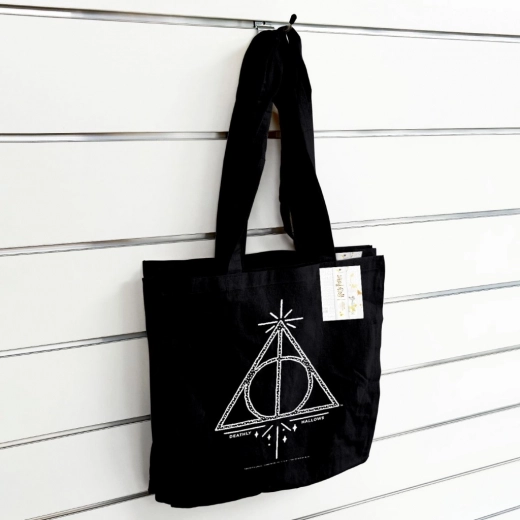 Táto štýlová taška s ikonickým symbolom Relikvie smrti ponúka skvelý doplnok pre každého fanúšika Harryho Pottera. Vyrobená z kvalitného plátna, je nielen odolná, ale tiež šetrná k životnému prostrediu: