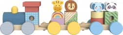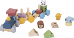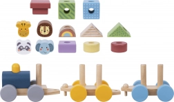 16 farebných dielikov a zvieratiek možno ľubovoľne kombinovať na kolíkoch vagónikov. Deti si samy volia, ako bude vláčik vyzerať, a rozvíjajú fantáziu aj logické myslenie.