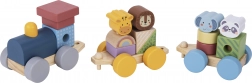 - lokomotíva + 2 vagóniky s kolíkmi, farebné bloky a zvieratká (žirafa, lev, slon, panda)