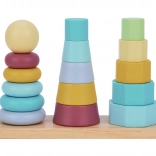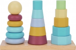 Tri veže od Tooky Toy prinášajú deťom zábavu aj učenie v jednom. Pastelové tvary sa ľahko uchopujú, skladajú sa na drevenú základňu a umožňujú deťom objavovať farby, tvary aj veľkosti. Ideálne ako prvá edukačná drevená hračka do detskej izby.