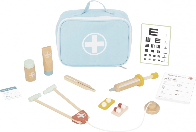 Stetoskop, teplomer, striekačka, očná tabuľa a ďalšie pomôcky z kvalitného dreva podporujú bezpečné a nápadité hranie.