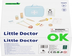 Súčasťou je 11 dielov: látkový kufrík, stetoskop, striekačka, teplomer, „lieky“, tuba s masťou, fľaštička na lieky, balíček lekárskych kariet, očná tabuľa a menovka lekára. Vďaka prehľadnému uloženiu v kufríku je sada ideálna aj na cesty a ľahko sa upratuje.