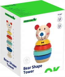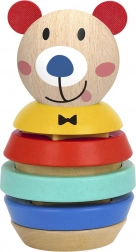 Drevená pyramída s medvedíkom spája hru a učenie. Farebné krúžky, hviezdičky a ďalšie tvary sa skladajú na tyč a do správnych pozícií, čo podporuje logické myslenie a priestorovú predstavivosť. Deti si hravou formou osvojujú triedenie podľa tvaru, farby a veľkosti.