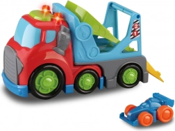 Zábavné prepravné auto Kiddy Go! poteší najmenších vodičov: ponúka svetelné a zvukové efekty aktivované tlačidlom na streche kabíny, kolieska na voľnobeh a v balení nájdete aj malé autíčko. 2× AA batérie sú súčasťou, hračka je vhodná od 18 mesiacov.