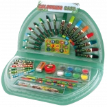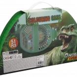 Maľovací kufrík polkruhový Dino je kompletná výtvarná sada pre deti v praktickom uzatvárateľnom kufríku. Nájdete v ňom fixky, voskovky, vodové farby, pastelky, obyčajné ceruzky, pravítko, strúhadlo, gumu, štetec aj samolepky s dinosaurami – ideálne na doma aj na cesty.