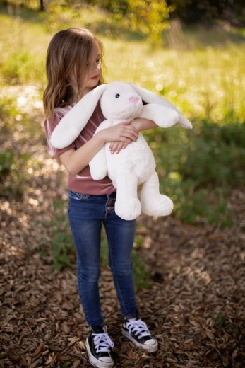 S veľkosťou približne 41 cm je tento zajačik dostatočne veľký na to, aby poskytol útechu a zároveň bol kompaktný pre ľahké prenášanie.