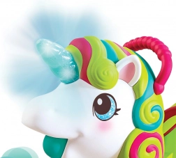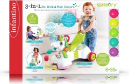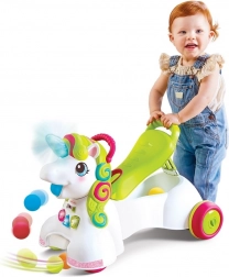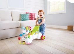 Sedadlo možno ľahko zdvihnúť pre režim chôdze a sklopiť pre jazdu; pod sedadlom aj vpredu je priestor na loptičky. Jednorožec vie zbierať rozhádzané loptičky a vypúšťať ich na podlahu alebo do košíka. Zadné kolesá majú 2 nastavenia rýchlosti pre začiatočníkov aj skúsenejších chodcov. Mäkký roh sa po dotyku rozsvieti, čo deti motivuje k interakcii a objavovaniu.